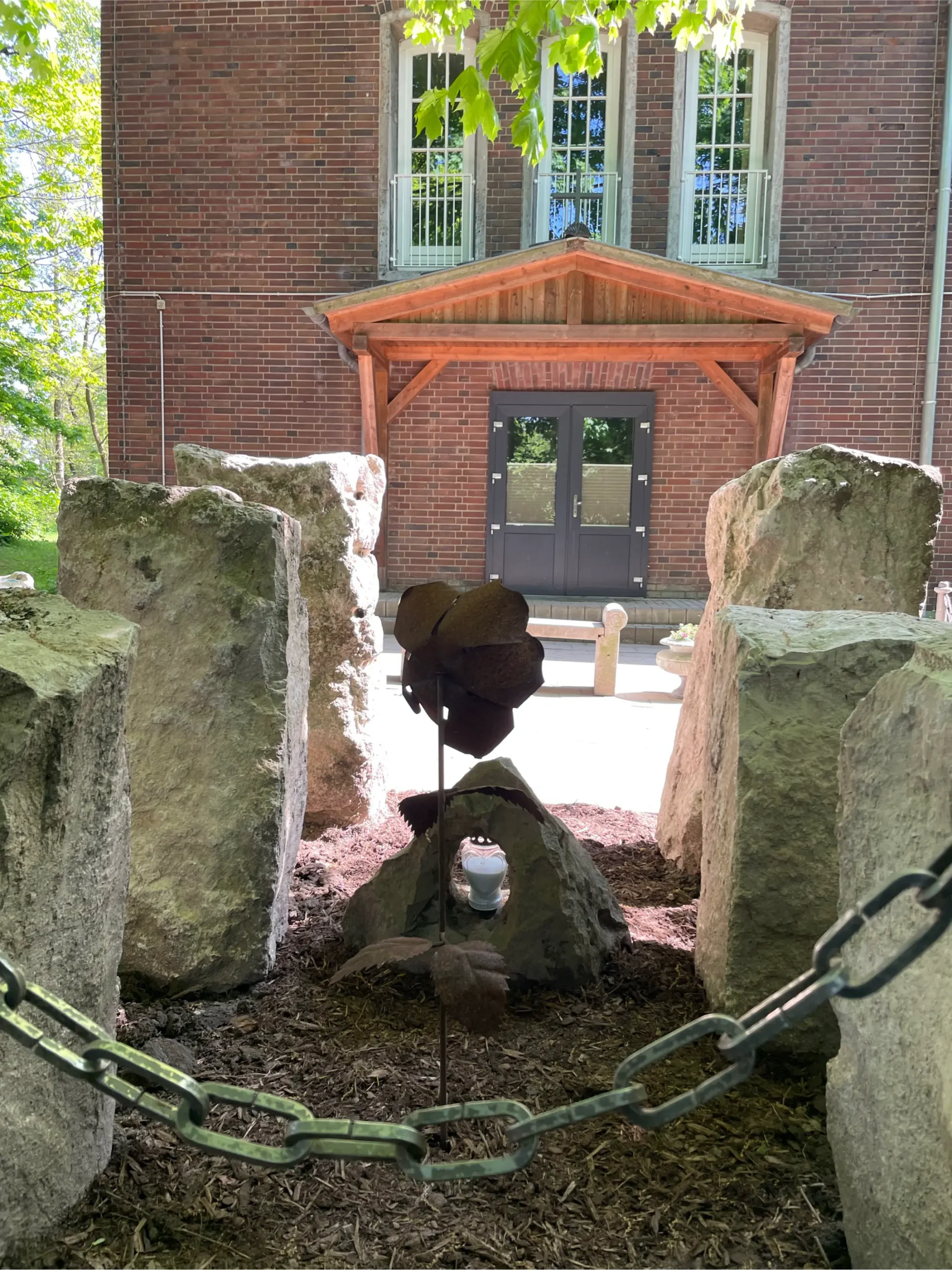 Einen weiteren sanften Bruch der Symmetrie bewirkt die mit Rindenmulch ausgelegte Blickachse auf die mittig in der Formation platzierte Steingrotte. Hier bietet sich die Möglichkeit, kurzzeitig selbst ein Teil der Antreteformation zu werden oder eine Kerze zu entzünden. Mittig hinter der Steingrotte ragt eine Metallrose heraus und symbolisiert die Liebe, die über den Tod hinweg weiterbesteht.